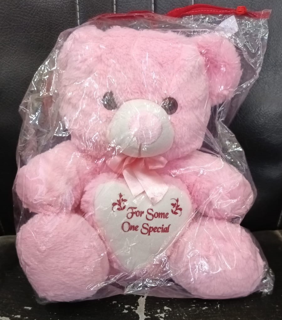 This is a pink plush teddy bear with a heart that reads “For Some One Special”.