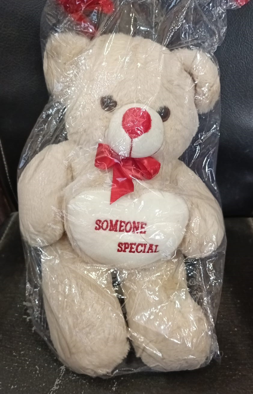 This is a white or cream-colored plush teddy bear with a red bow and a heart that says “SOMEONE SPECIAL”.